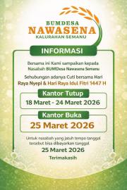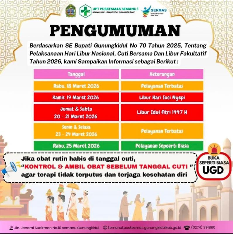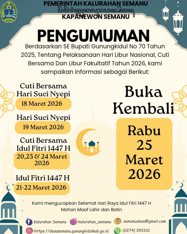 Semanu (SIDA) – Kalurahan Semanu melkasanakan libur pelayanan masyarakat mulai hari Rabu sampai dengan hari Selasa tanggal 18 sampai dengan 24 Maret 2026.